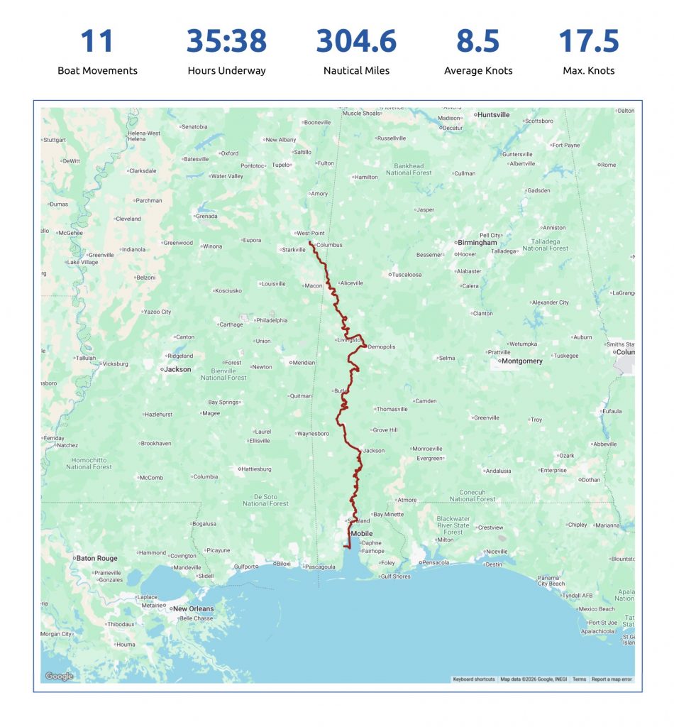 The map shows the end of the river system, from Columbus to Mobile, Alabama